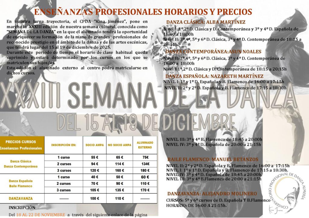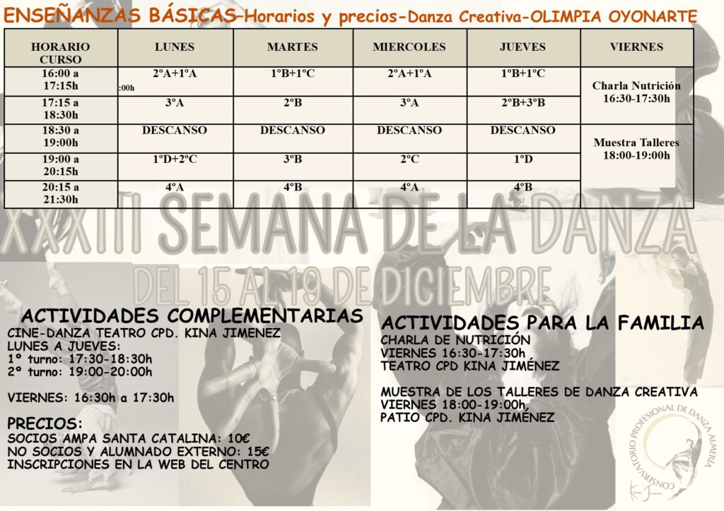 La SEMANA DE LA DANZA tendrá lugar del 15 al 19 de diciembre de 2025. Durante este periodo de tiempo el horario de clase habitual queda suprimido y estará determinado por los cursos en los que se matriculen sus hijos/as.